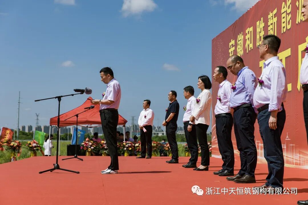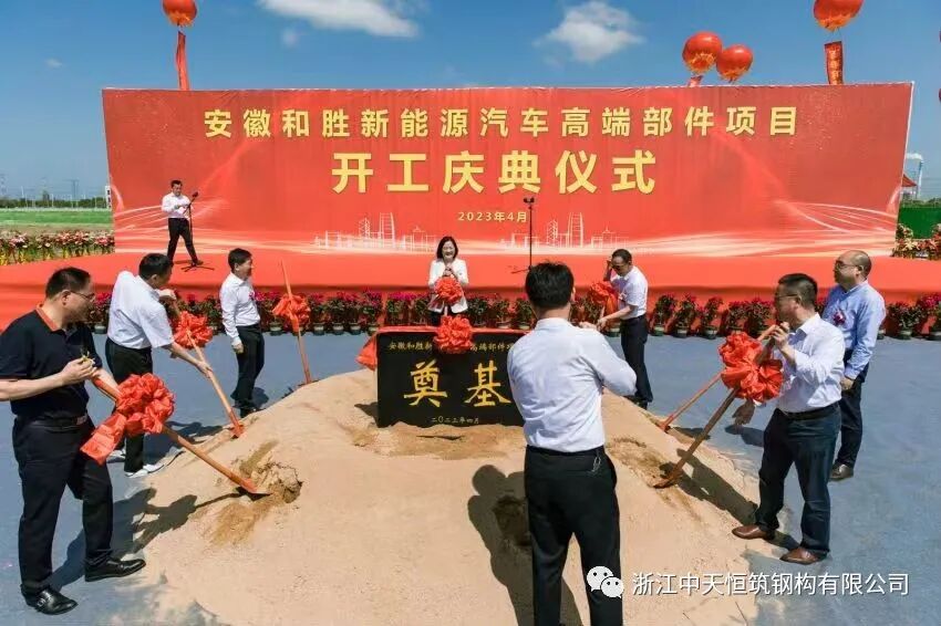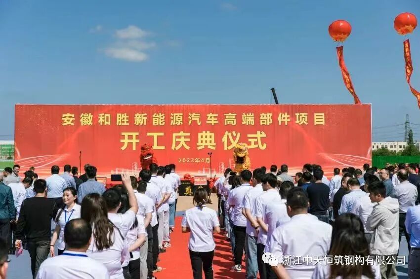 4月20日,安徽新能源高端汽车部件项目开工奠基仪式隆重举行。活动现场喜气洋洋,一派欢欣鼓舞。政府领导、业主单位广东和胜工业铝材股份有限公司董事长李建湘、项目负责人及管理团队、监理单位总监和中天恒筑钢构董事长蒋金生、副总经理周映、工程部经理付建新、项目经理金爱民及项目部管理团队人员一同出席了本次开工仪式。